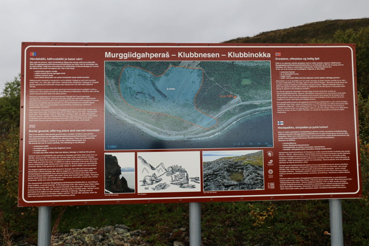 ausen Murggiidgahperaš/Klubbnesen er et hellig fjell og det har en gang vært en offerplass her. Gravene, offerplassen og fjellet er automatisk fredet jamfør Kulturminnelovens § 3. Vi ber publikum om å ferdes med forsiktighet og ikke ta ut steinheller, byg