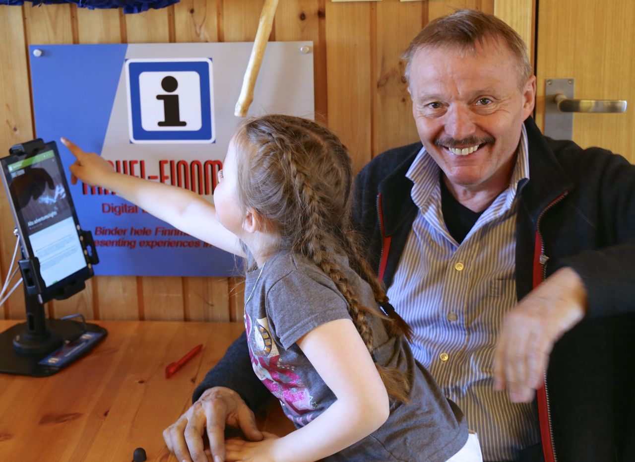 Folke Strand skal lære barnebarnet, – seksåringen Lisabet, å bruke Travel-Finnmark som turistinformasjon, men blir fort usikker på hvem som lærer hvem.