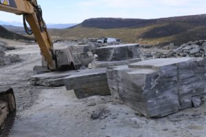 Young Simon grabs the sledge and a sharp-cut chisel that he strikes into the natural slit in the slate block. He follows the slit around the whole stone. Then he continues a round until the stone drops with a sigh and divides perfectly. Then Simon leads the crane with the vacuum pump so that it can suck in the stone and lift the separated part. This is how the smooth, perfect surface appears.Now he can split the separated part (hella) and split it down to the desired thickness. This is called «pinning» the stone down to «pin stone».The next step is to mark the stone with a template that he has available. He has templates for the sizes the market wants.