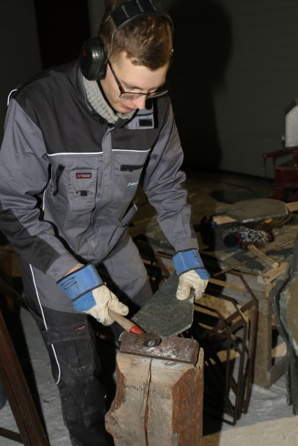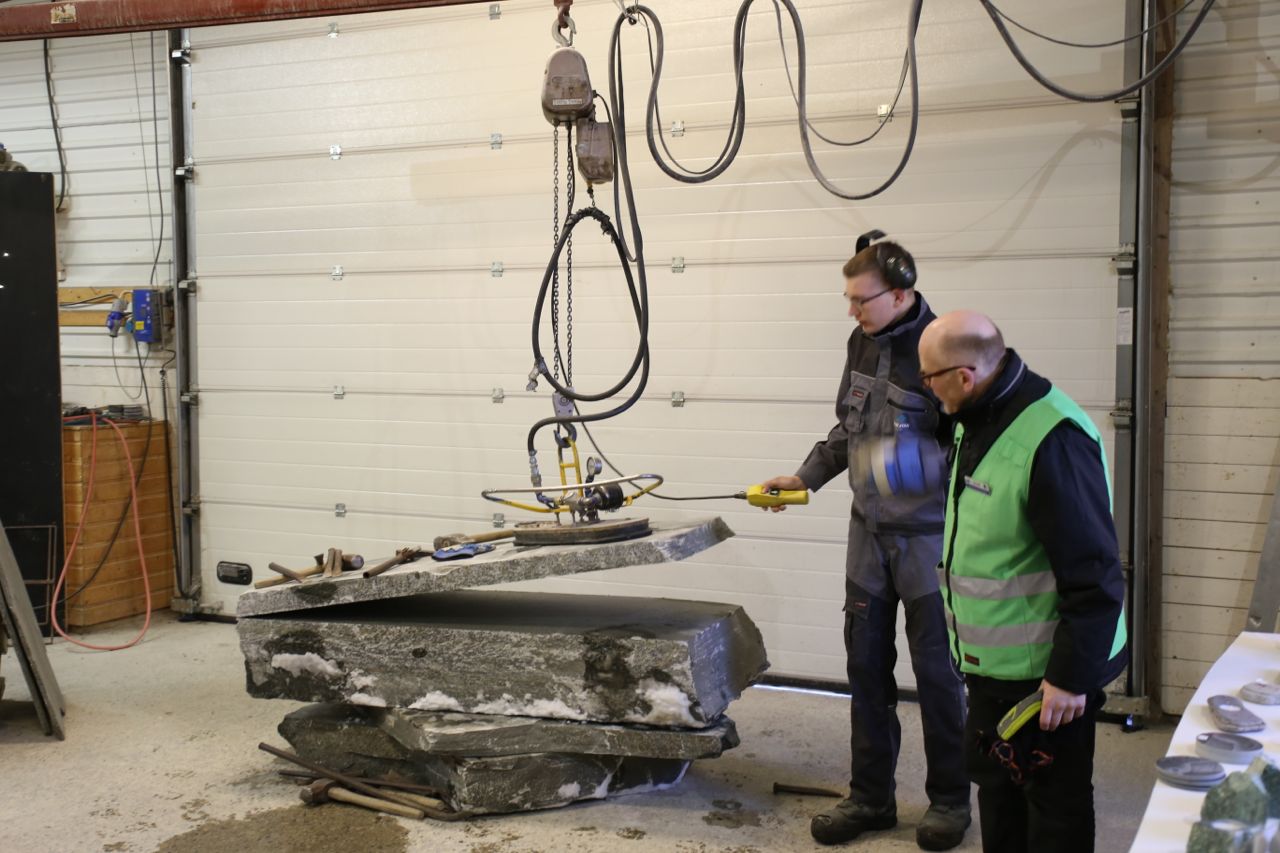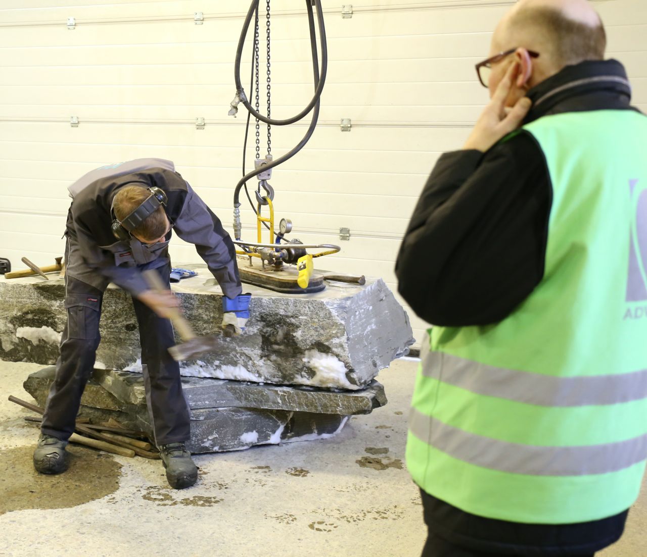 Unge Simon Strifeldt griper slegga og en skarpslipt meisel som han slår inn i den naturlige spalten i skiferblokka. Han følger spalten rundt hele steinen. Så fortsetter han videre en runde til før steinen slipper med et sukk og deler seg helt perfekt. Så leder Simon krana med vakuumpumpa så den kan suge seg fast i steinen og løfte den fraskilte delen. Slik kommer den glatte, perfekte overflaten til syne.