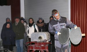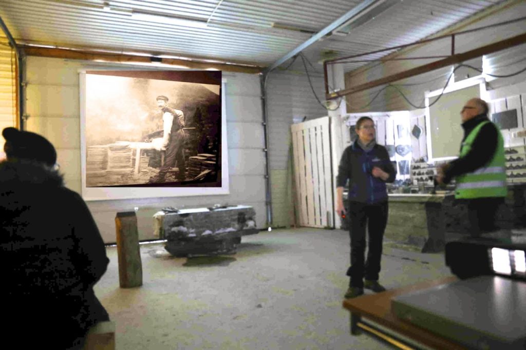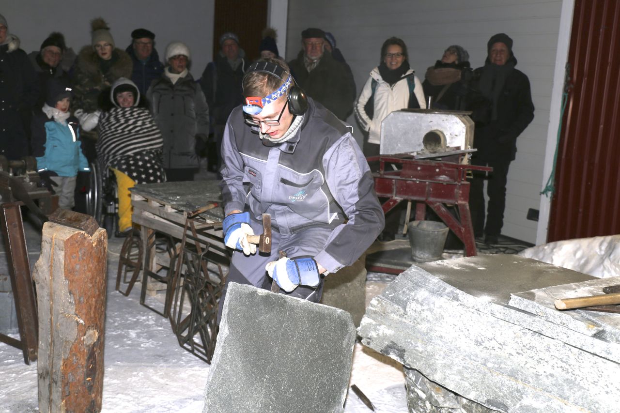 High above Alta, on the plateau in Finnmarksvidda lies Pæskatun. A small business that makes products of the famous Alta slate. This product is sold worldwide. The raw materials are blasted straight out of the mountain in great style. They have employed many for over a hundred and fifty years. In addition to producing roof tiles, tiles, tombstones and slate slabs, Pæskatun welcomes travelers in groups who wanted to see how the slate products are made, not only with an exciting slideshow, but also with practical work using past and present craft and industrial tools. The production, which has been going on for over a hundred and fifty years, has had ups and downs. When one of Pæskatun’s holders, Ellinor Strifelt, talks about the development, she fully captivates the audience, assisted by a professional guide and interpreter who presents the information in the language that is best for the audience. She goes through the creation for approx. 590 million years ago until we now have a block of slate of a few tons in front of us.