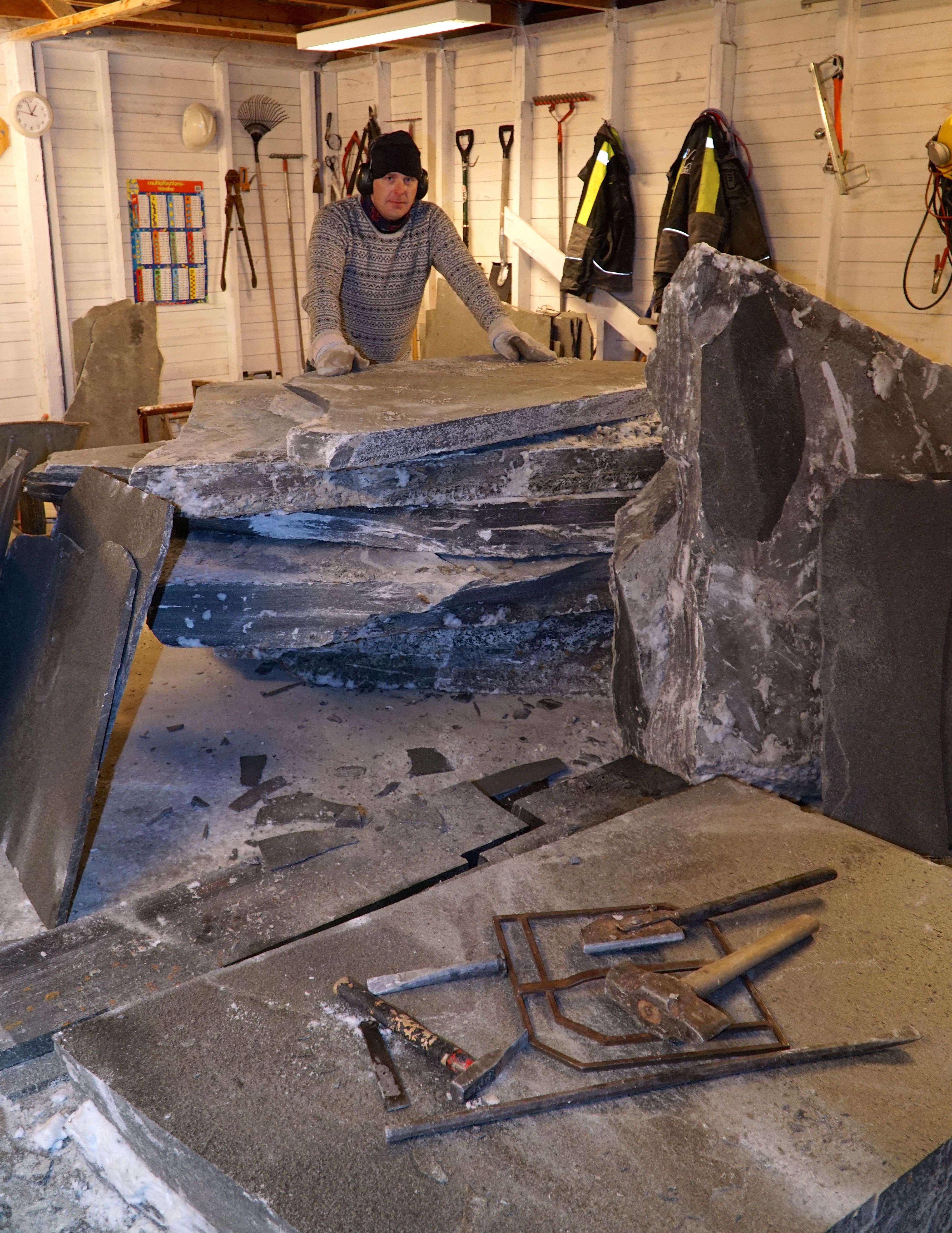 everal hundred «boys» who blew the mountain with gunpowder instead of dynamite to extract shale blocks. Gunpowder explodes more slowly and crushes not the mountain the same way. The blocks were processed, split and divided into «pinnastein» which was cut with the old hand axes. The final products were made into roof tiles and tiles . Every monday morning the slate driver pack his backpack and goes to the mountains to be away all week. The others farm or have other activities during the summer to spend the winter in shale rock. Today there is another life in shale rock. Firms are not large and consists of sole proprietorship and small corporation. All are equipped with modern technical equipment to take the mountain out of production. The methods are the same as in the old days, but everything takes place in a different tempo. And largely by mechanical means. Excavators and Front loaders get loose the blasted rocks and bring it up to the hall where the processing is being done. «Debris» will be removed and transported to the tip. Mechanically, or not. The slate is treated with knowledge, dexterity and with hammer and chisel. In the thirty miners in the mountain are experienced and conscientious professionals who bring shale with pride to the port for further transport out on the world market. /esh