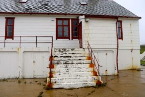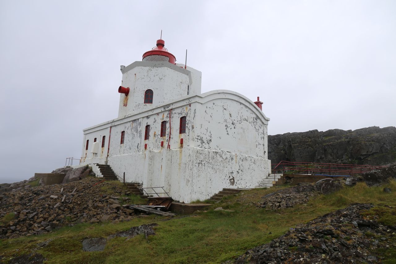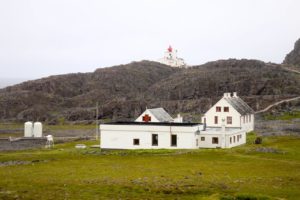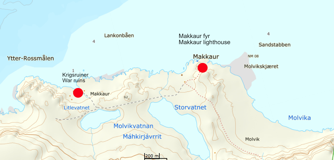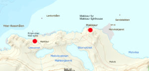 Makkaur’s fortress is located at the far end of the Båtsfjord. The building is a concrete building with vaulted ceiling and tower on the roof. The plant has clear resemblance to the concrete structure of the Geitungen Foundation in Rogaland, and the Sletringen Foundation in Sør-Trøndelag. A 3rd-order flashblower, machine tank with pressure tanks for diafon fog systems and aggregates is intact. The lighthouse building and the four-lighthouse dwelling are preserved before the war. A dry-walled road runs between the four-story building and the rest of the building. This includes housing, outbuildings and tufts for residential and outbuildings. The buildings were demolished as late as the 1980s, and a poorly adapted building, currently used for housing and machine houses, was set up outside the yard. A cast road leads down to the boathouse and landing. The lighthouse building has a dominant position on top of a crush in a rugged mountain landscape, and the quay building is one of the country’s most