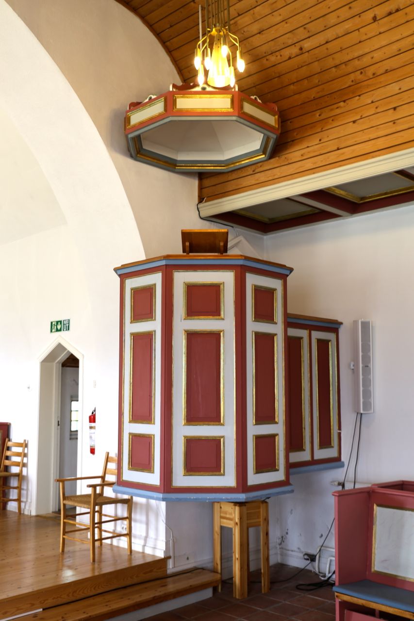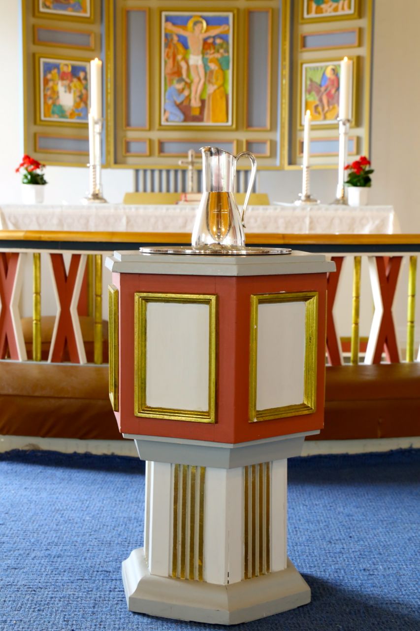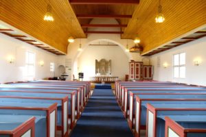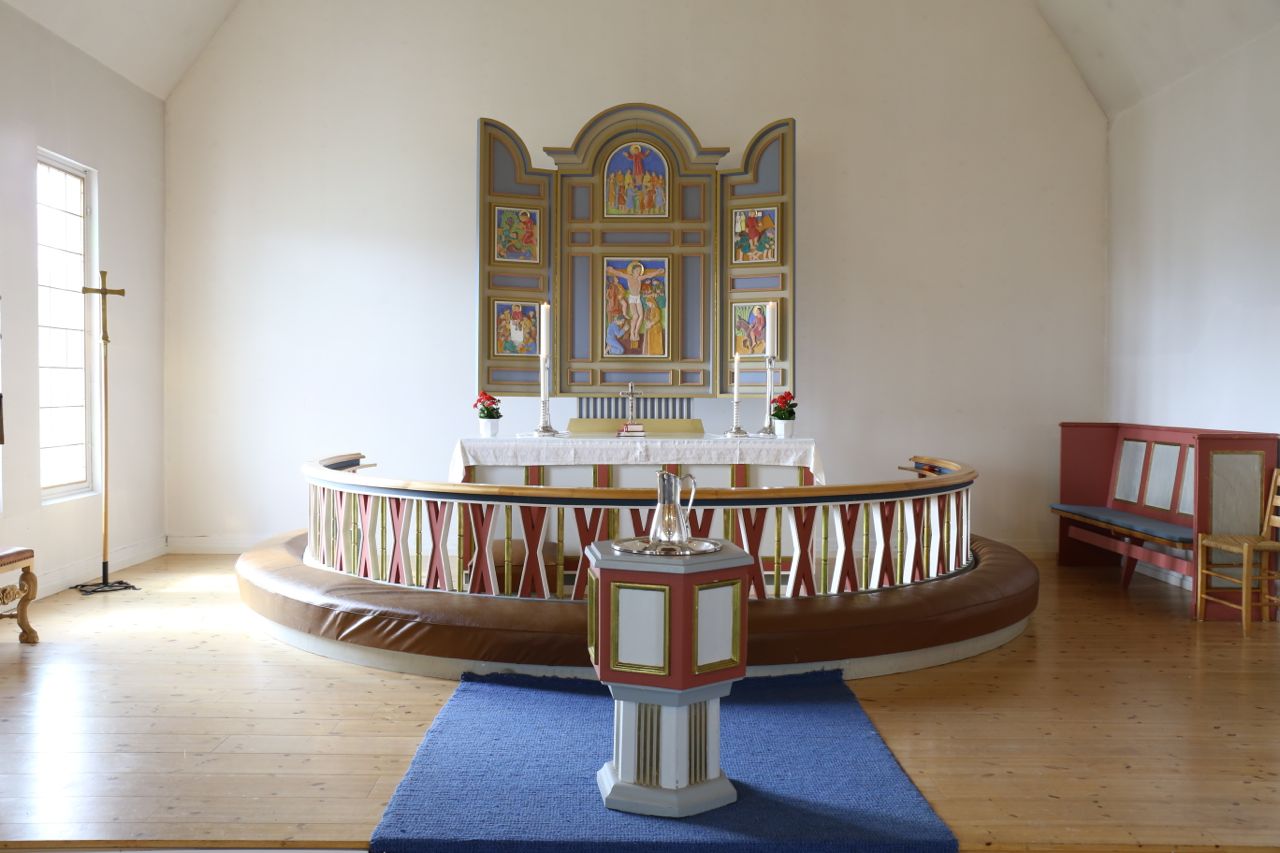 Civil defense was required to install a larger shelter in the basement. Just before Christmas in 1960 the new church was ready for consecration, which was made by Bishop Wiig on December 11 that year. The new whitewashed church was a regular church with approx. 300 seats and an organ gallery with space for the song choir. The church tower is about 10 meters high, the main entrance is in the east which together with the tower forms the facade towards the rest of the building and the harbor.