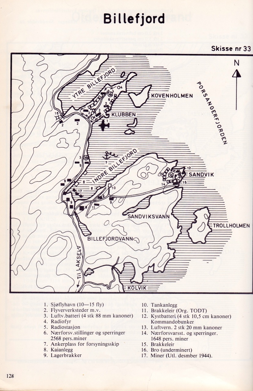 Anleggene i indre Billefjord ble sprengt 11. desember 1944. Etter at tyskerne hadde dratt seg ut ble fjorden minelagt.  (27/12 1944)
