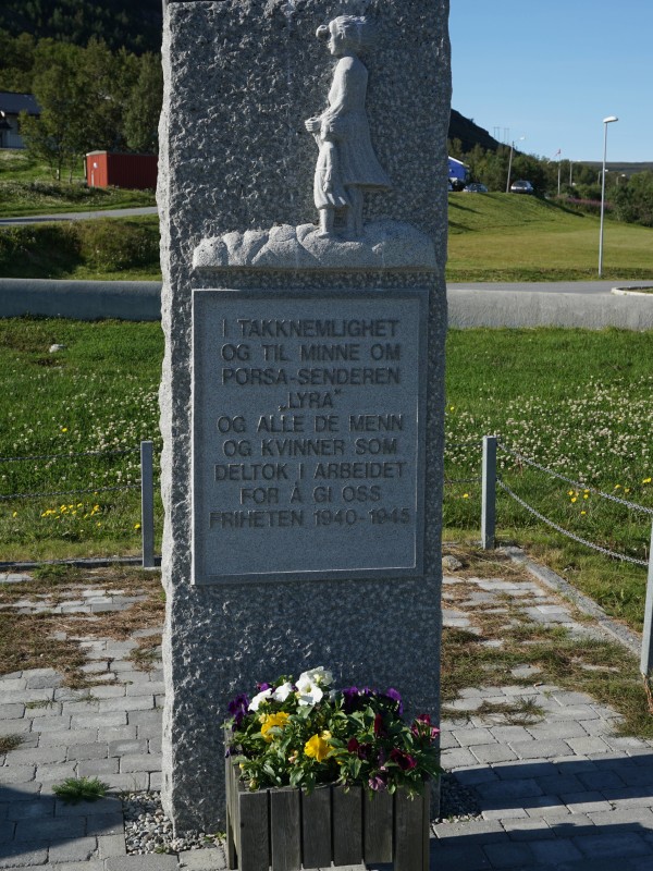 Reist i takknemlighet og til minne om Porsa-senderen ”Lyra” og alle de menn og kvinner som deltok i arbeidet for å gi oss friheten 1940 – 1945. Erected in gratitude and remembrance of Porsa transmitter «Lyra» and all the men and women who participated in the work to give us freedom from 1940 to 1945. Google trans. …
