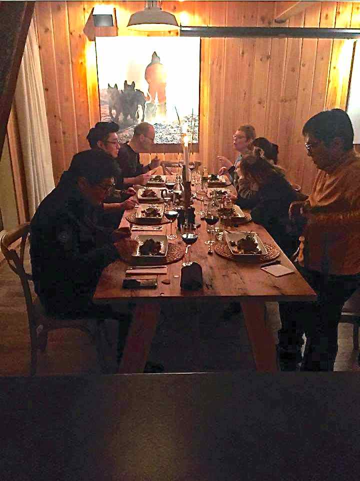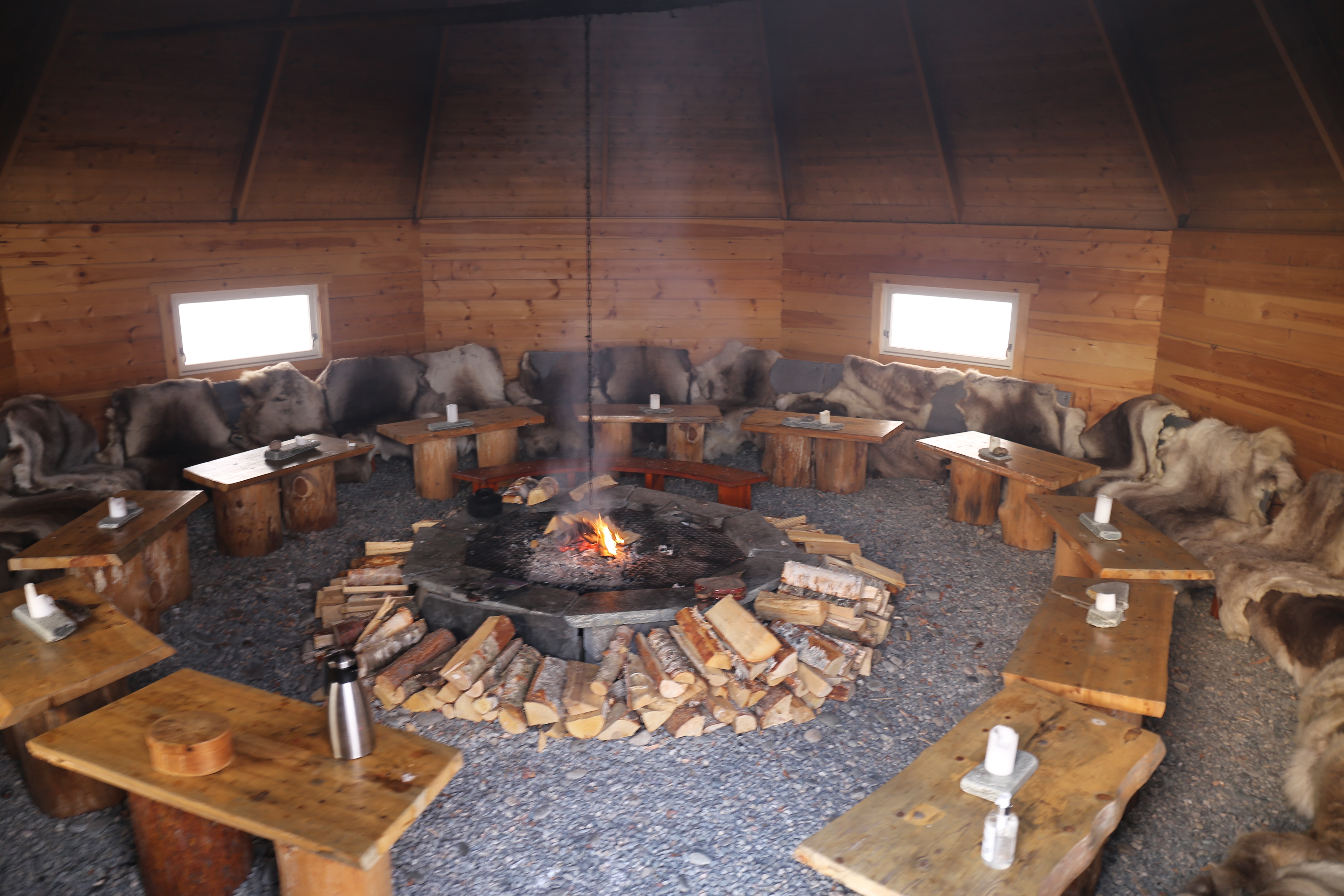 Det gamle fjøset er bygget om til et elegant spise- og oppholdsrom, preget av bedriftens innhold, villmarksliv med hunder og god mat.