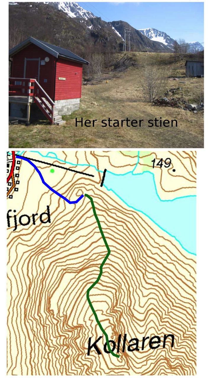 Her slutter den merkede stien (blå). En tar så så til høyre og følger ryggen mot Storkollaren (grønn på kartet). Det er enklest å gå rett opp. Etterhvert slakker terrenget ut. Det er spesielt god utsikt over Bergsfjord fra trigpunktet på toppen.