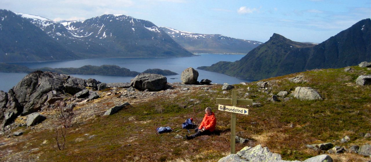 The trail starts between school and teacher accommodation at the sign Gullmundstind. The trail crosses the road and continue up the hillside past the old inverter. Then it goes up the pass to trail-Delete Long Ridge – Gullmundstind. From trail-Delete is no marking on the top. Aim vessel left for the sharp outcropping of Gullmundstinden (Forward Draw). From the top of the vessel follows a ridge to the top.