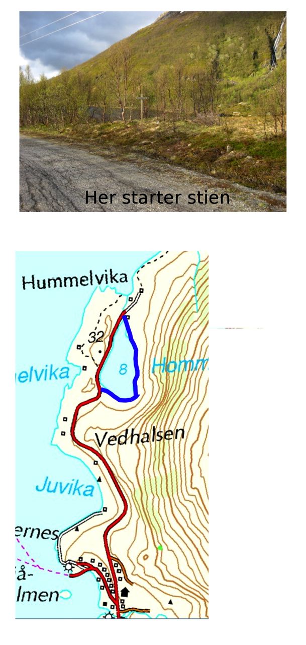 The trail starts at the waterworks house at the bridge over Bergfjord river. Then it continues right up the hill then turning slightly right. Eventually it goes steeply up towards clearing in the woods below Lillekollaren. One follows the valley with Lillekollaren left until one is at the highest point in the valley.