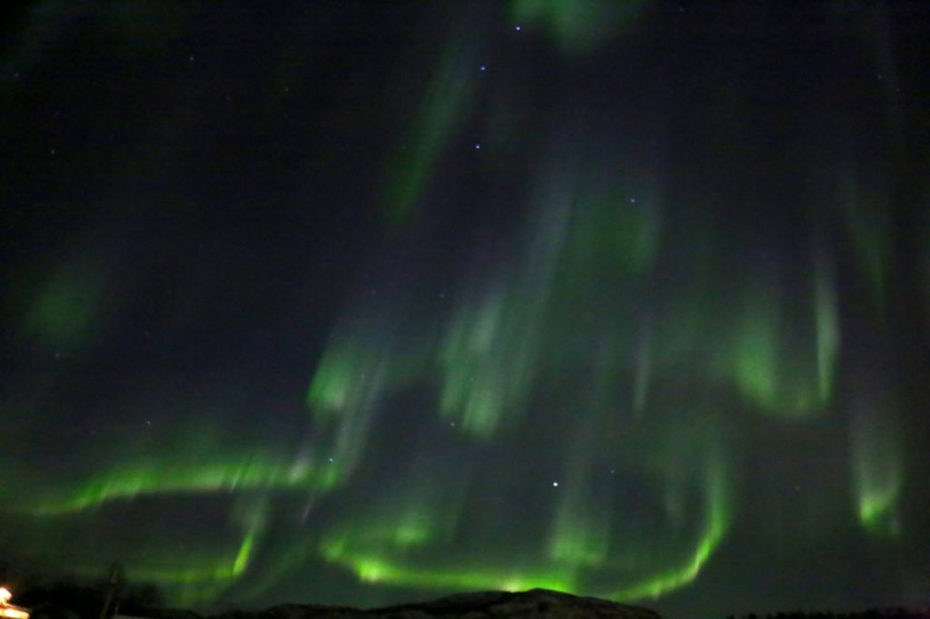 Lekende lett og med sprakende bevegelser dekorerer det himmelen med grønnskjær ispedd alle farger. Du kan ikke fange det om du prøver. Med ett dukker det opp og setter hele himmelen i brann. Nordlyset blafrer som ilden gjør i kraftig vind. Det smeller! Så er det borte som om det blir sugd ut av himmelen. I neste øyeblikket er det tilbake.