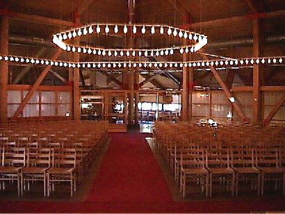 The building has a square ground plan, but the nave is diagonally oriented, with the altar to the north. Around church room rear part is different rooms for work church features including it’s fireplace lounge in the open area to the south, in the opposite corner of the shrine party.