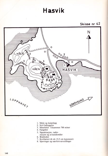 Det tyske anlegget på «Håen» ble oppstilt i Stuttgard i mars 1942. Dette anlegget skulle egentlig til Gammelvær i Loppa, men stillingen der var ikke rekognosert da anlegget kom til Norge. Batteriet ble derfor satt i den allerede påbegynte stillingen på Hasvik i april 1942. Festningsverket var strategisk viktig, fordi tyskerne måtte ha kontroll over innseilingene til Stjernsund, Rognsund og Sørøysundet, og dermed ha full oversikt over trafikk mot Hammerfest og Alta. Dette fordi tyskerne hadde etablert en stor flåtebase i Altafjorden hvor blant annet slagskipene «Tirpitz» og «Shornhorst» hadde tilhold. Nærforsvaret var godt utbygd med en rekke stillinger og sperringer. Tilsammen var det lagt ut 700 miner. I forbindelse med utbyggingen var det som tidligere nevnt anlagt en fangeleir for russiske krigsfanger. Det var også opprettet en signalstasjon for kontroll av skipstrafikken, samt en luftvaktpost. Tyskerne hadde store trivselsproblemer fordi de tyske batteriene var konstant underbemannet, tjenesten var svært rutinepreget med få hendelser og det harde klimaet og mørketida slet på soldatenes psykiske helse. Historien om den unge tyske soldaten Konrad Setznagel kan stå som et eksempel på dette: