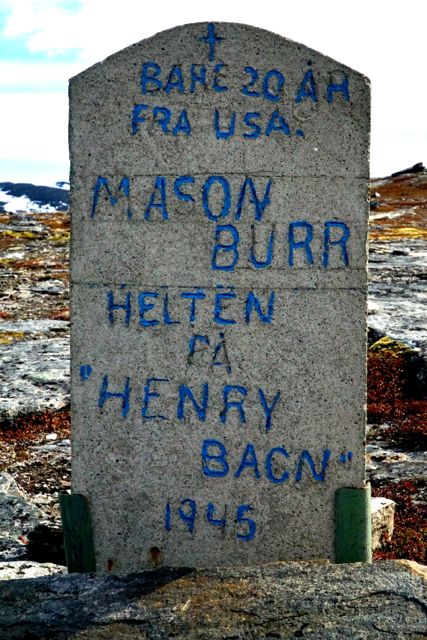 Nearly two years ago I came across this memorial, a hundred yards from a gravel road, leading nowhere off the coast of Finnmark, northern-Norway. On the memorial it read: Mason Burr, hero of the SS Henry Bacon, only twenty years old. On the backside it read; these are some of the dramas of the evacuation of Finnmark, 1944. After finding this memorial I couldn’t quite rest, so I asked one of the old timer locals from Klubbukt, where this memorial was raised. He could tell me the memorial was in memory of a Sailor of an American navy ship. Further study led me to the story of the SS Henry Bacon, the last of the libery class frigates that was sunk by the Luftwaffe in WW2. From what I have gathered sailor Burr remained on station after the evacuation was ordered from the sinking SS Henry Bacon. He was hit by shrapnel and died instantly. The SS Henry bacon carried Norwegian civilians who had refused to evacuate Finnmark, staying behind in hiding in the freezing winter months. The SS Henry Bacon carried civilians from the Island of Sørøya, near to where I am from to safety. The gunners of the SS Henry Bacon took with it 5 luftwaffe planes. The body of sailor Burr washed ashore in Klubbukt, Finnmark and was sent overseas, to be burried at Arlington. A local, unknown who – raised the memorial in sailor Burrs memory. This story has touched me deeply, its a very vivid reminder of the horrors of war and the incredible sacrifice of the sailors of the SS Henry Bacon. For the sacrifice of Sailor Burr and the crew of the SS Henry Bacon – Thank you – your sacrifice will not be forgotten, flowers will be put down every year in memory of the heroes of the SS Henry Bacon. /Private Holm