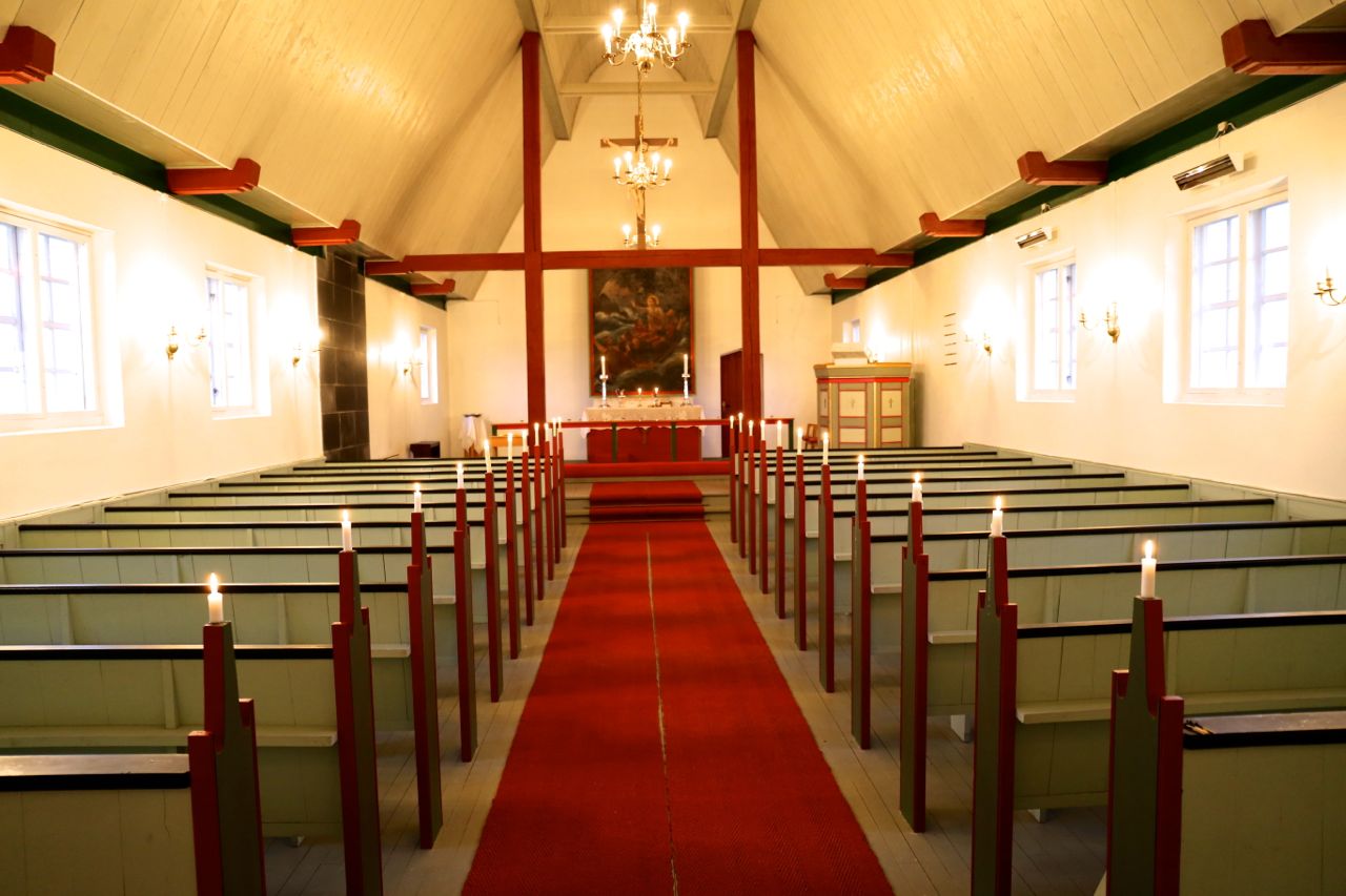 The altar of the church is from 1932, and was saved when the previous church was burned. The altar table shows Jesus who sets the storm. In addition, you saved the silverware, and the church bells were later found again.
