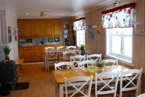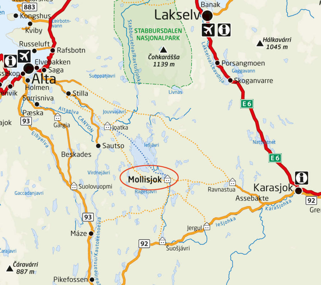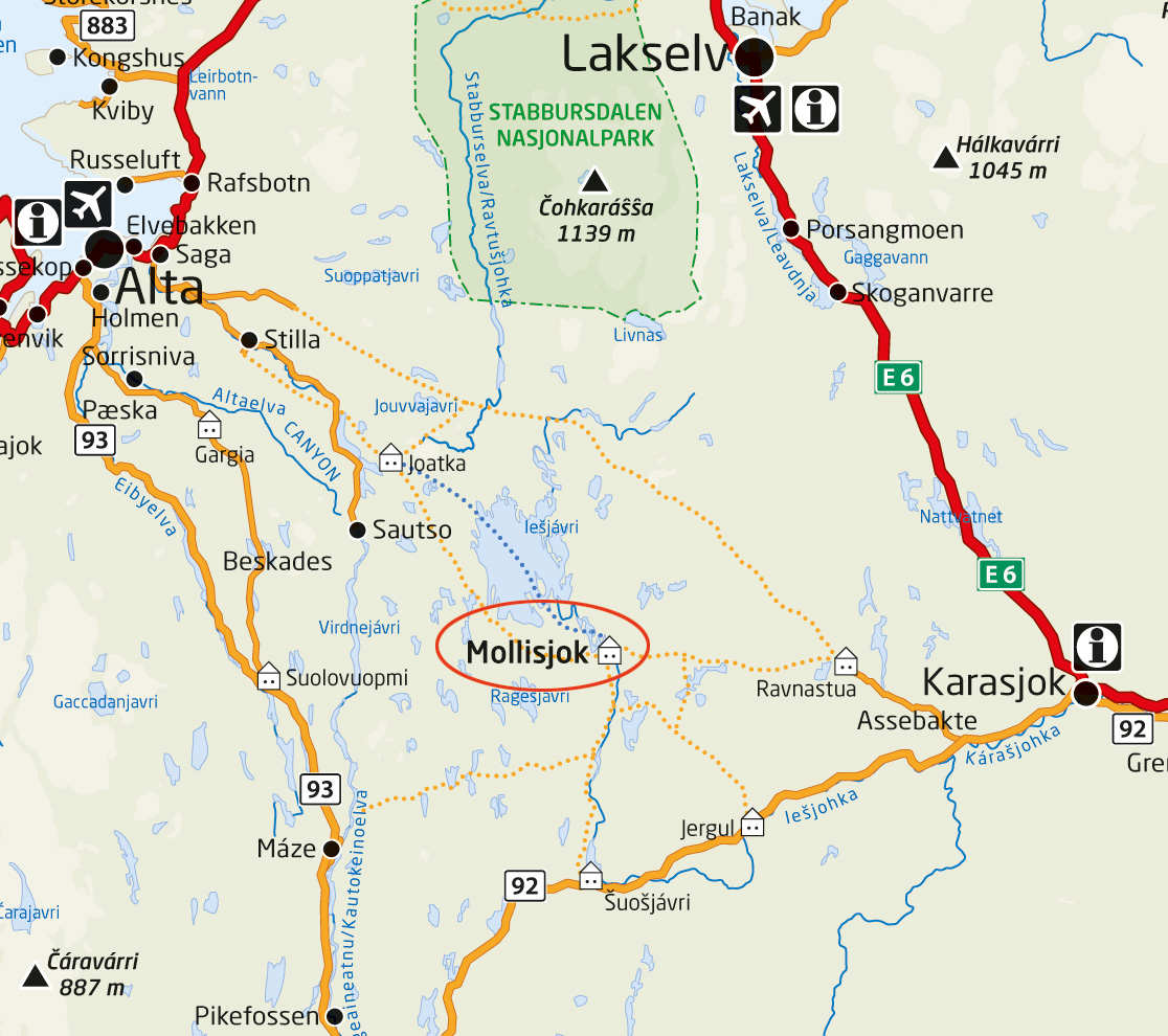 The lodge is idyllically situated on the river Jiesjohka, which originates from Finnmark’s largest lake Jiesjavri, 10 km north of the lodge. Jiesjohka is the first part of the Tanavassdraget, Norway’s 3rd longest river. There are wide expanses and panoramic views from the lodge. North towards Porsanger the mountain massif Gaissene travels 1100 m.o.h., Mollisjok is at about 400 m.h.