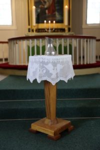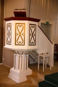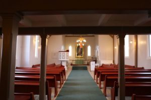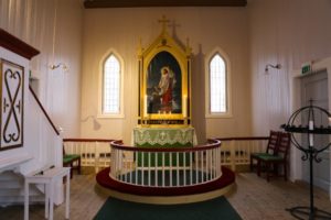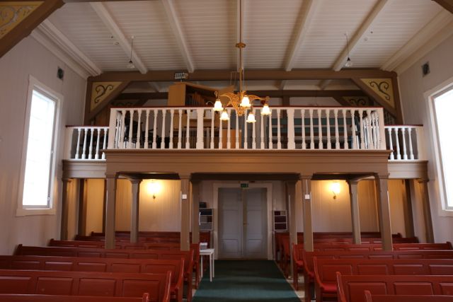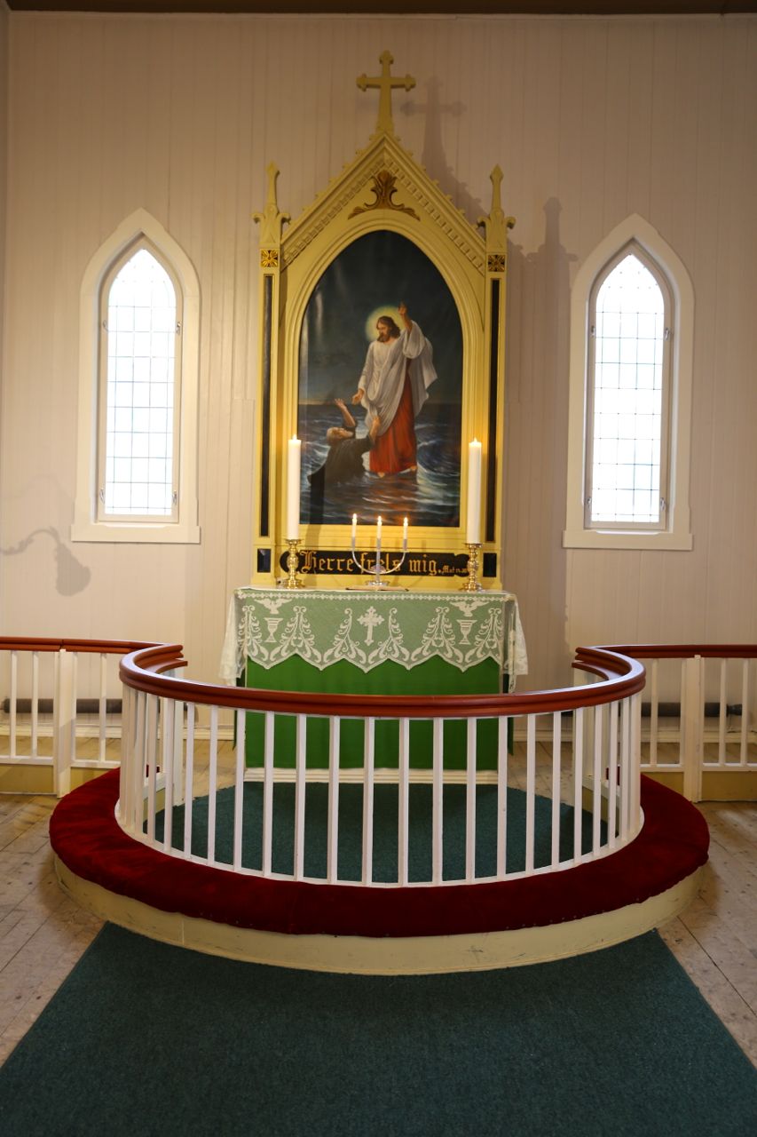 In 1978-79, the church was restored after plans had been made to tear it down. Damage in the walls was repaired, windows were replaced with copies of the original and floor and ceiling was insulated. The church also got new benches with vans that were close copy of the old ones. The colors in the interior are probably the same as originally. The altarpiece with framing in neo-Gothic style shows Jesus rescuing the descending Peter on the Genesar Sea.