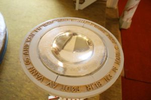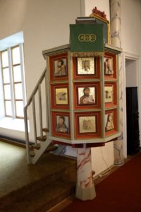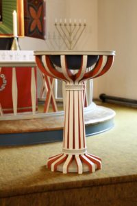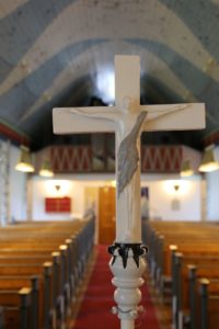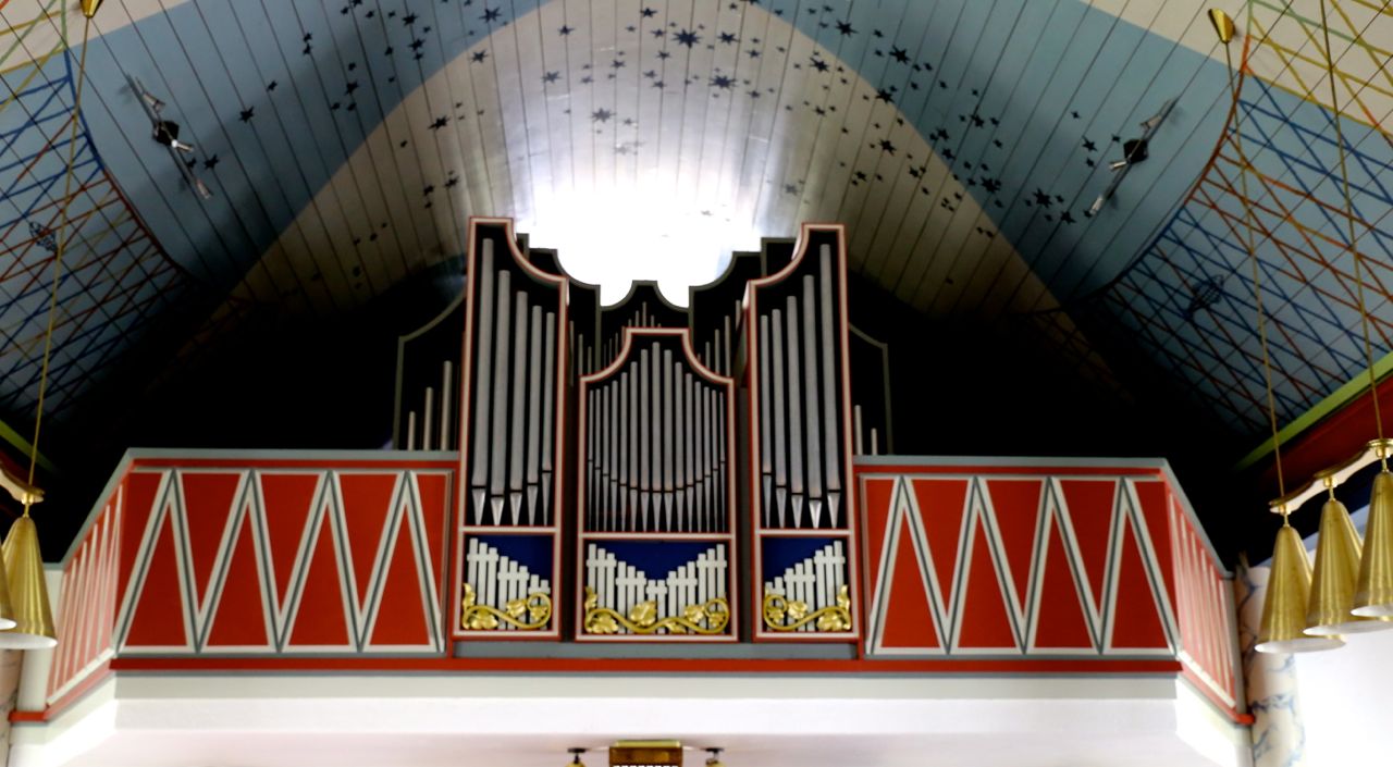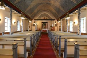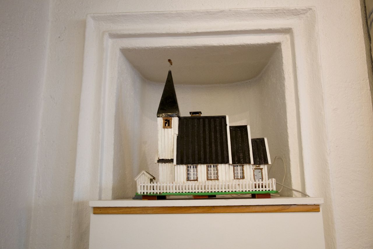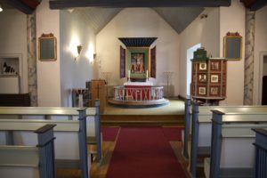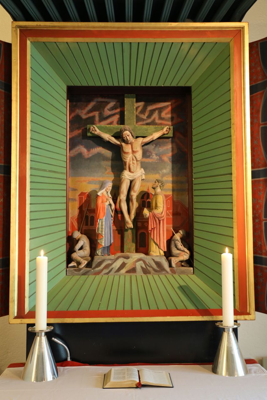 The roof of the church ship is decorated with a roofing painted by Carsten Lien. The painting represents fishing nets and stars, with the outline of a ship in the background. The architect and Lien collaborated with the wooden caretaker Hanna Jessen to create the altarpiece, which shows Jesus on the cross. The architect also designed both the pulpit and the baptismal font.