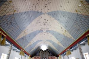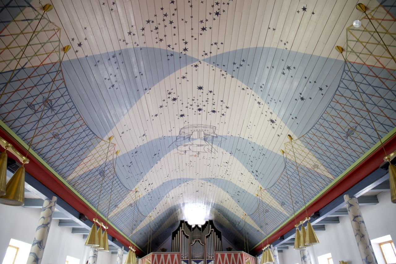 Taket i kirkeskipet er dekorert med et takmaleri laget av Carsten Lien. Maleriet forestiller fiskegarn og stjerner, med konturene av et skip i bakgrunnen. Arkitekten og Lien samarbeidet med treskjæreren Hanna Jessen for å lage altertavlen, som viser Jesus på korset. Arkitekten tegnet også både prekestolen og døpefonten. Kilde: Wikipedia