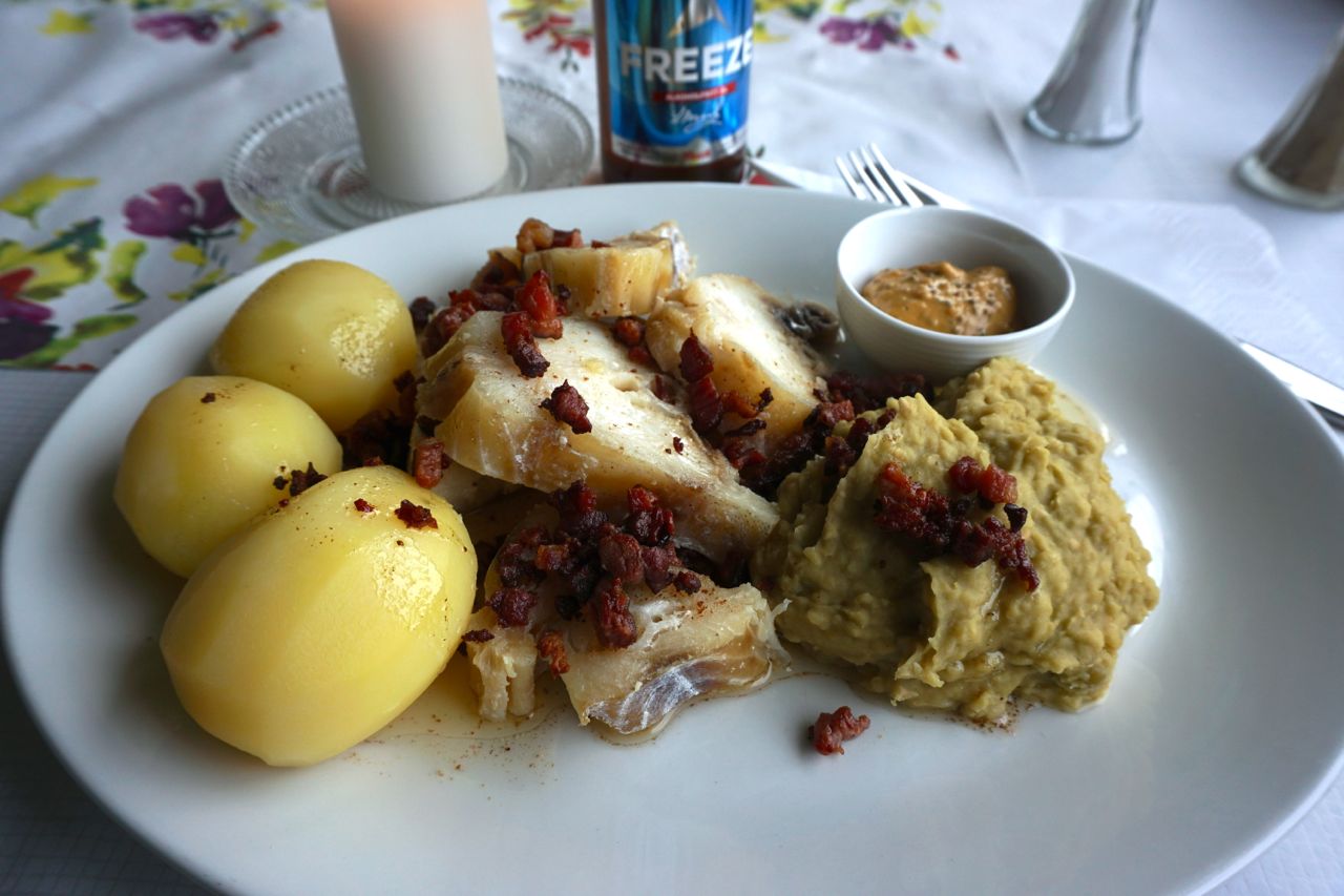 «Boknafesk» is a delicacy in northern Norway, and served preferably with bacon, green peas stew, dopp and boiled potatoes. «Dopp» is unseasoned thick white sauce made of margarine, flour and milk.