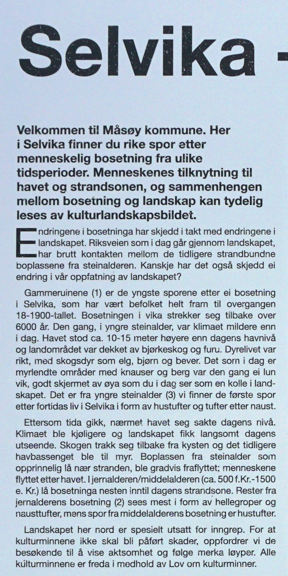 Selvika is an ancient settlement along the RV 889 between Kokelv and Havøysund. The site has been inhabited from the Stone Age until about 1800-1900. You can even remnants from settlements that have been built in line with the sea has decreased over time. Today it is a popular destination for residents of Måsøy municipality. It’s built a concrete monument containing sanitary facilities, barbecue area. The monument has bl. a. got the price for the use of concrete.