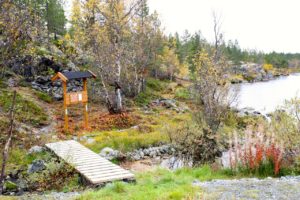 Directions: RV 885 from Hesseng. You come to Firkantvannet approx. 20 km from Hesseng. On the right side of the road there is a small parking lot where it starts with marked paths. Follow the path marked with blue (cyan). Follow the signposted road where it says «Namdalen 3 km.» Then you go straight to Nordre Namdalen farm. See the image of the starting point.