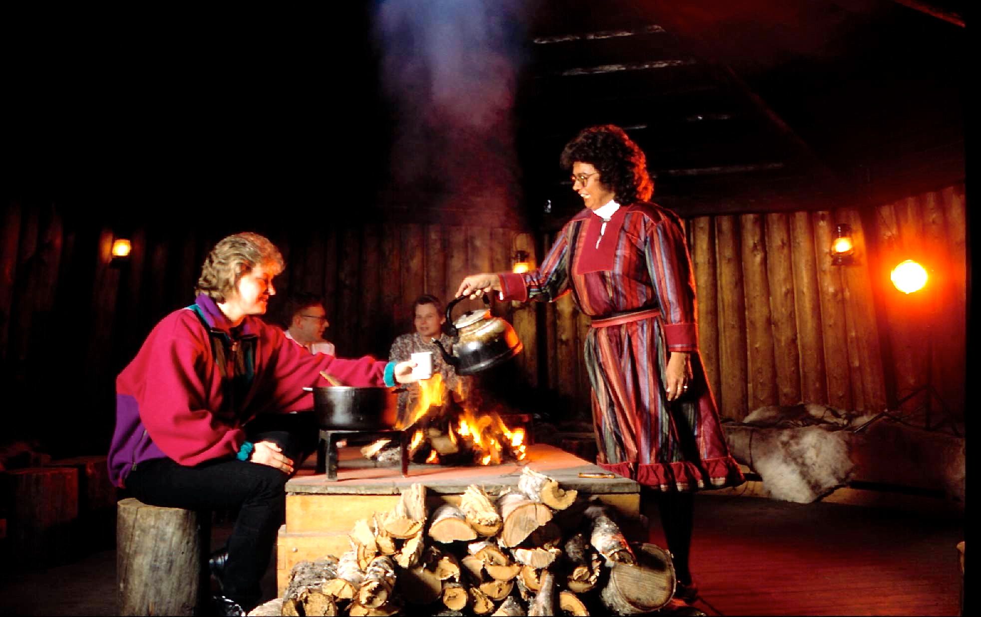 Restaurant Storgammen Taste Sami food Alongside reindeer and cloudberries can Sami cuisine offers many dishes of fish, game and berries. The visit to Sápmi Park is not complete without a Sami meal and Storgammen is an outstanding eatery right in Sápmi Park. Restaurant Storgammen is built with inspiration of four traditional huts and accommodates 120 guests. Here you sit on soft leather seats around the hearth. The smell of bonfires mingles with pleasant aroma from Sami dishes served, and the atmosphere is warm and pleasant.