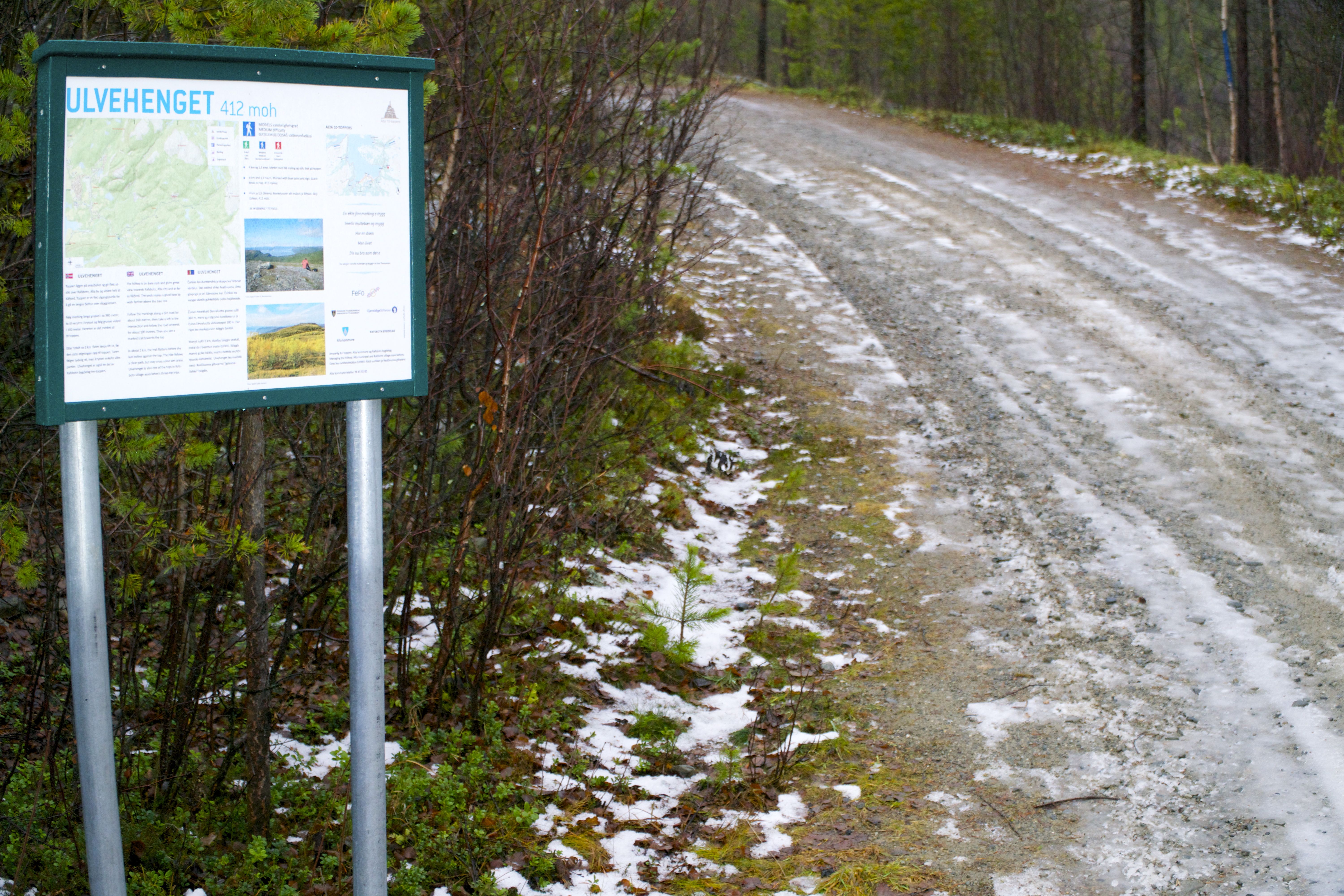 There is a sign at the start of the trail. The sign contains information about hiking destination, map and GPS coordinators. The information is given in Norwegian, Sami and English. The same information is available here on the website.