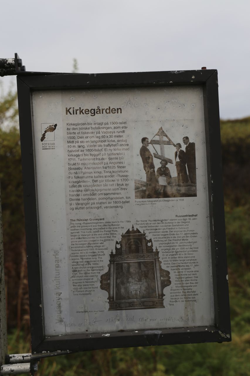 Ved inngangen til kulturparken ses sporene etter kirkegården som hørte til været. Her stod det også ei tømmerkirke på 1500-tallet. På 1700- og 1800-tallet ble kirkegården benyttet av russiske handelsmenn og sjøfolk, og ble derfor kalt «russekirkegården».